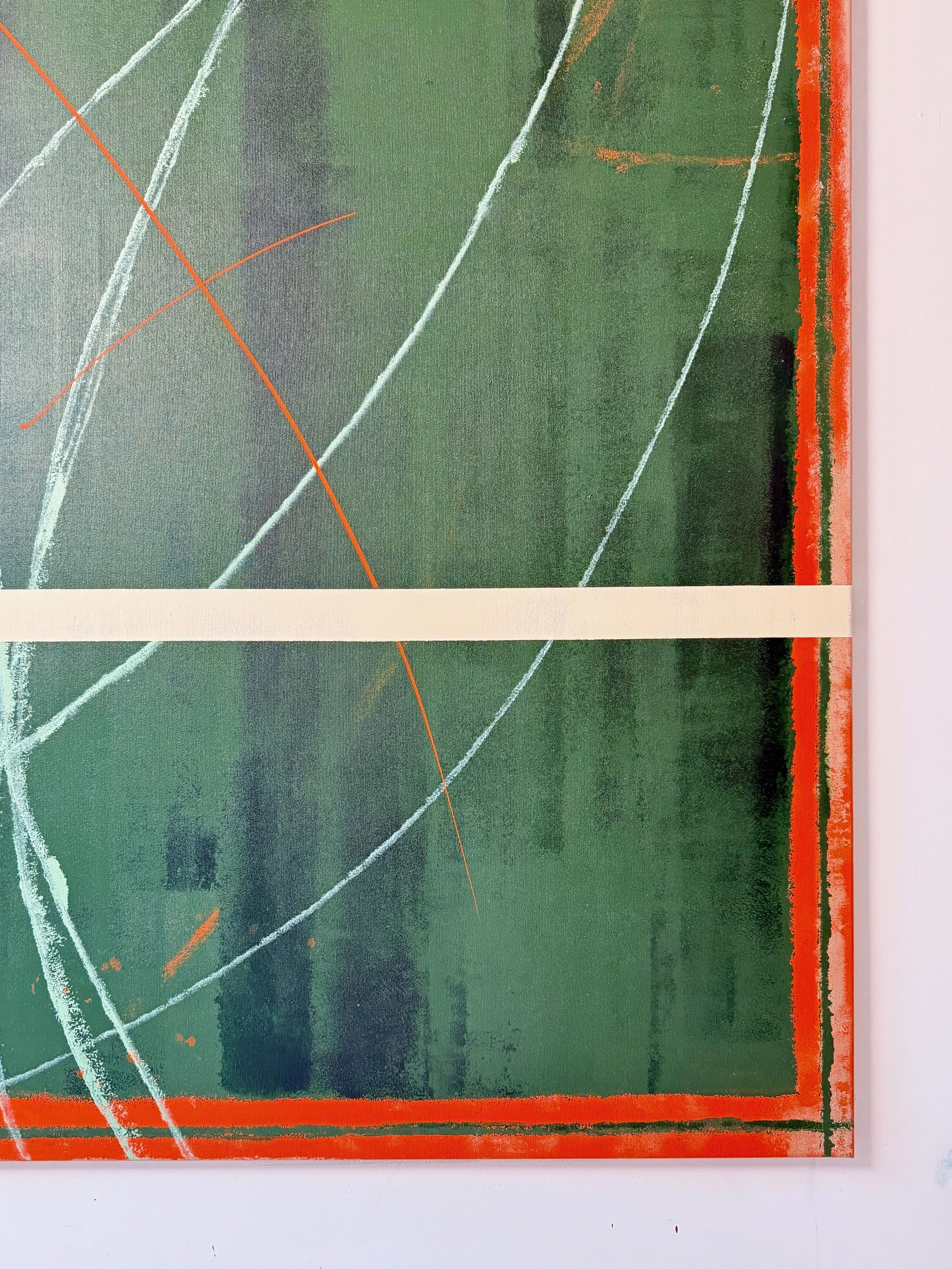 NIZENs Werke sind eine einzigartige Symbiose aus urbaner Dynamik und meditativer Ruhe. Sein kreativer Prozess beginnt oft mit der intuitiven Nutzung einer Malerrolle, mit der er geometrische Formen und klare Farbflächen gestaltet. Ein zentrales Element seiner Arbeiten ist der sogenannte Signature Color Block – ein kraftvolles, rechteckiges Farbfeld, das jedes seiner Werke unverwechselbar macht. Diese Klarheit steht im Kontrast zur rohen Energie, die er aus urbanen Landschaften bezieht.
